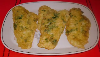 En un plato poner la harina, salar el pescado, enharinar, batir el huevo añadir el ajo y perejil bien picaditos, rebozar.